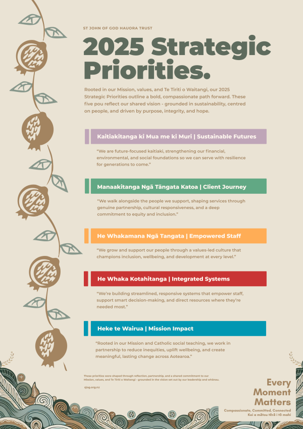 Looking ahead, our Strategic Plan 2025+ expresses an ambition that grows out of the lives of the people we serve. It challenges us to deepen our impact so that hope, dignity, and opportunity, are not the privilege of a few but the inheritance of all. With courage, aroha and integrity, we will continue to walk alongside people and communities, helping to shape a future where every life is valued, and every moment matters. Kei a mātou tērā i tō mahi.